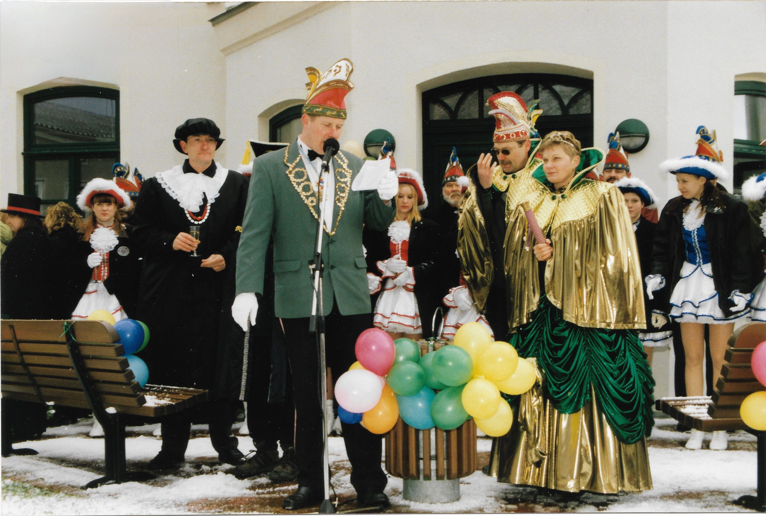 Denn wir waren das Prinzenpaar, das den Übergang in das neue Jahrtausend begleitete. Der viel beschworene Millennium-Crash blieb glücklicherweise aus – vielleicht auch, weil das Rathaus zu dieser Zeit saniert wurde. So fand die Schlüsselübergabe nicht wie gewohnt dort statt, sondern vor der Alten Schule.