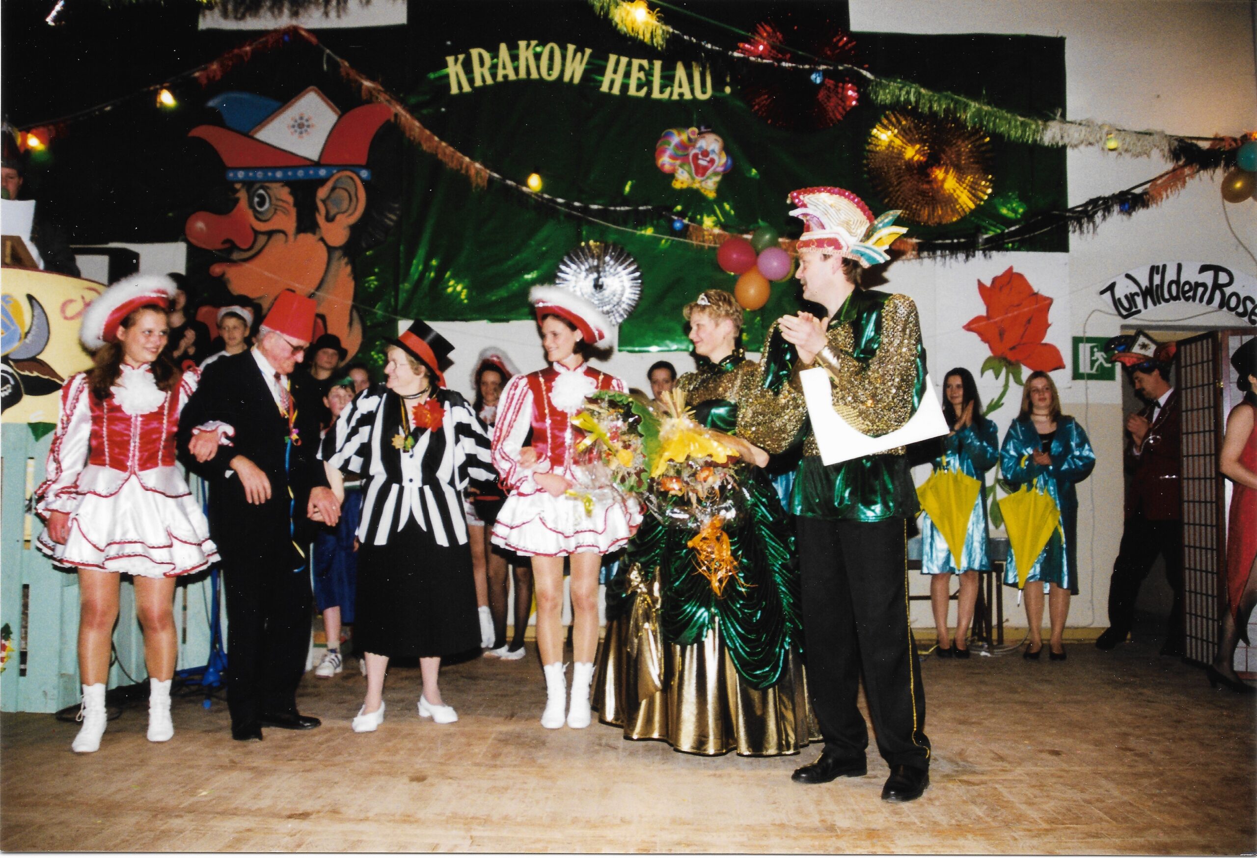 Netti und ich, dass war wunderbar. Wir standen vor der Narrenschar, als erstes singendes Prinzenpaar. Auch ehelich, dass musste nicht sein, nach fast 30 Jahren, tanzten wir auch hier, außer den Reih´n. Wir trugen die Kronen mit Stolz und Radau, auf uns ein einfaches „Krakow Helau“.